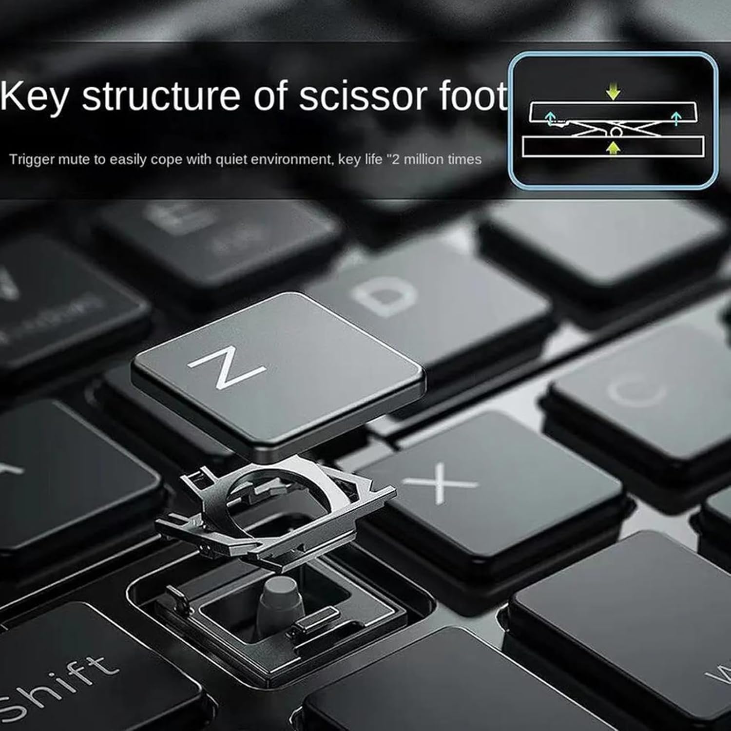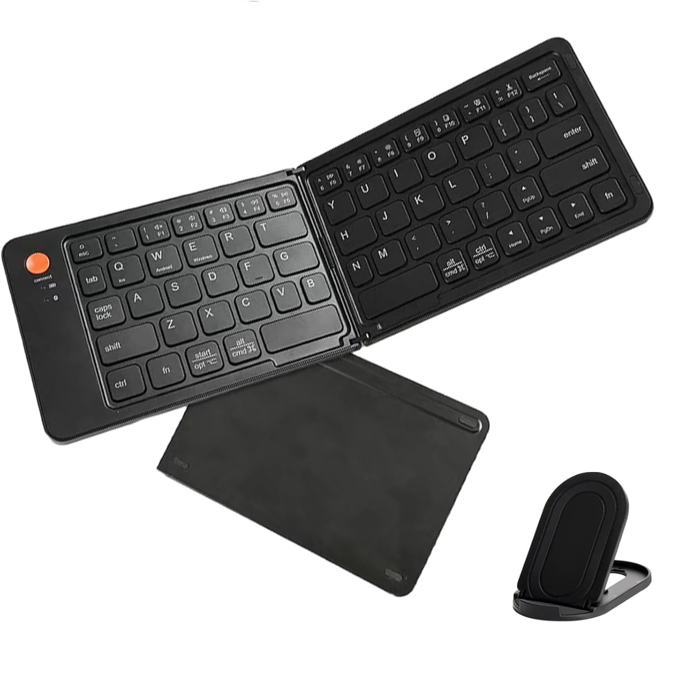 INTRODUCING THE BLUETOOTH FOLDABLE KEYBOARD: Take your work anywhere, anytime with this portable folding keyboard that comes with a complimentary phone holder. The keyboard design ensures precise and swift typing, mirroring the experience of your familiar desktop keyboard. The quiet keys enable you to concentrate on your tasks without distraction. With its Bi-Fold design Ideal for both travel and business trips.