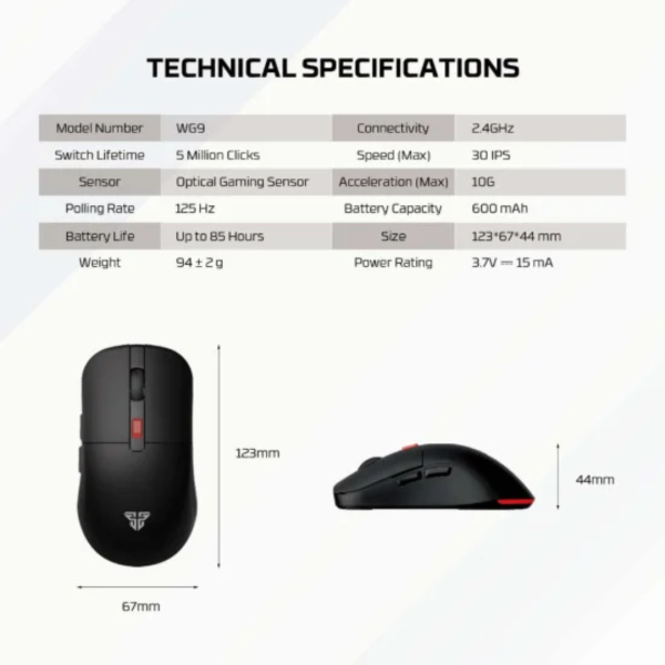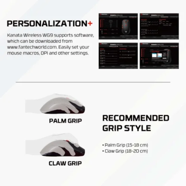 FANTECH KANATA WIRELESS Mouse RGB (WG9) – Rechargeable 600MhA Up to 85 Hours – Dual Mode (Strike speed wireless & Wired ) – Optical Sensor (2000DPI /30IPS / 10g / 500Hz) – Silent HUANO Switch 5Million Clicks – Support Win , PC ,Laptop Pad (Software) | Black
