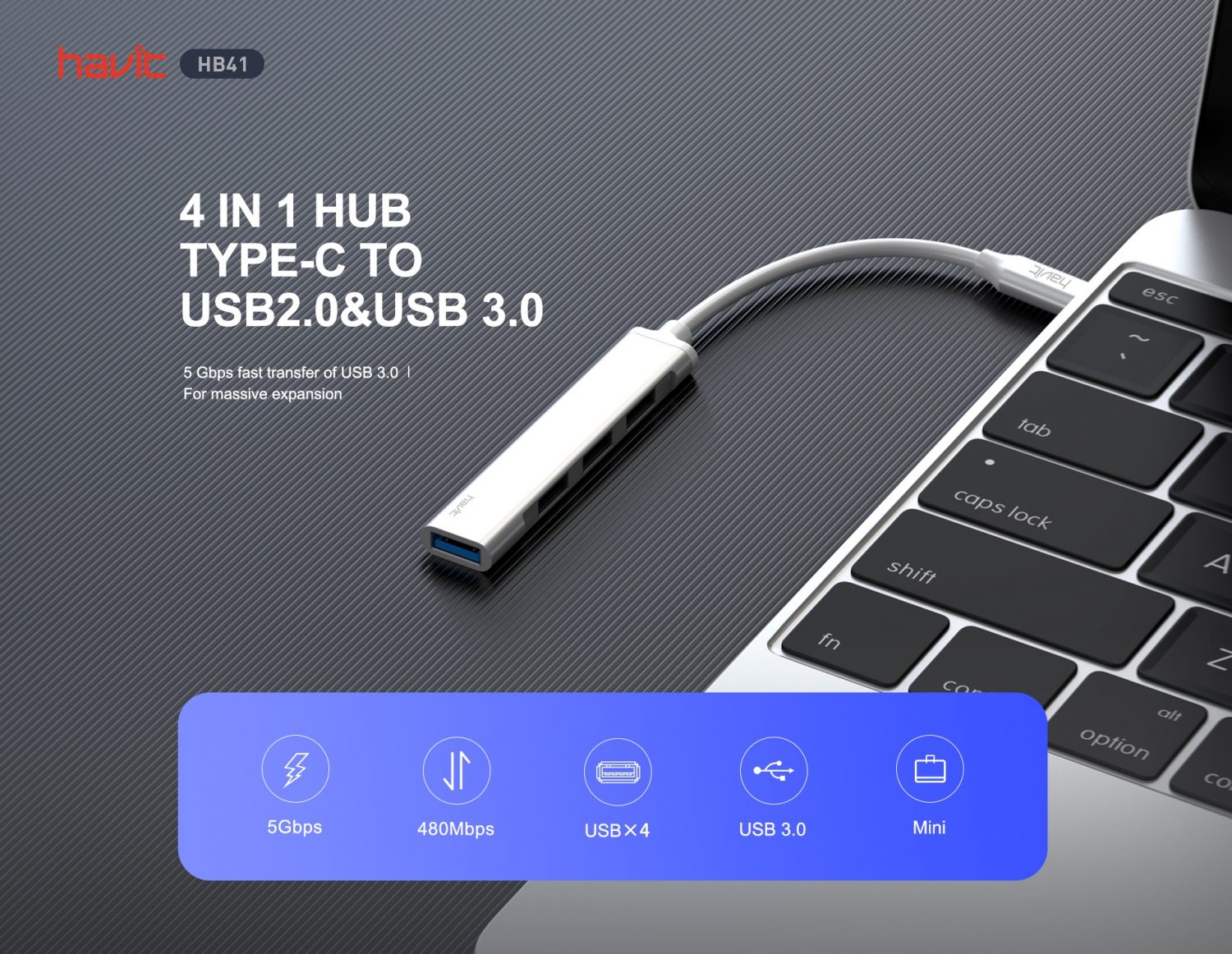 HAVIT HB41 Type-c Hub To 4xUSB – Transfer rate up to 5Gbps | Silver