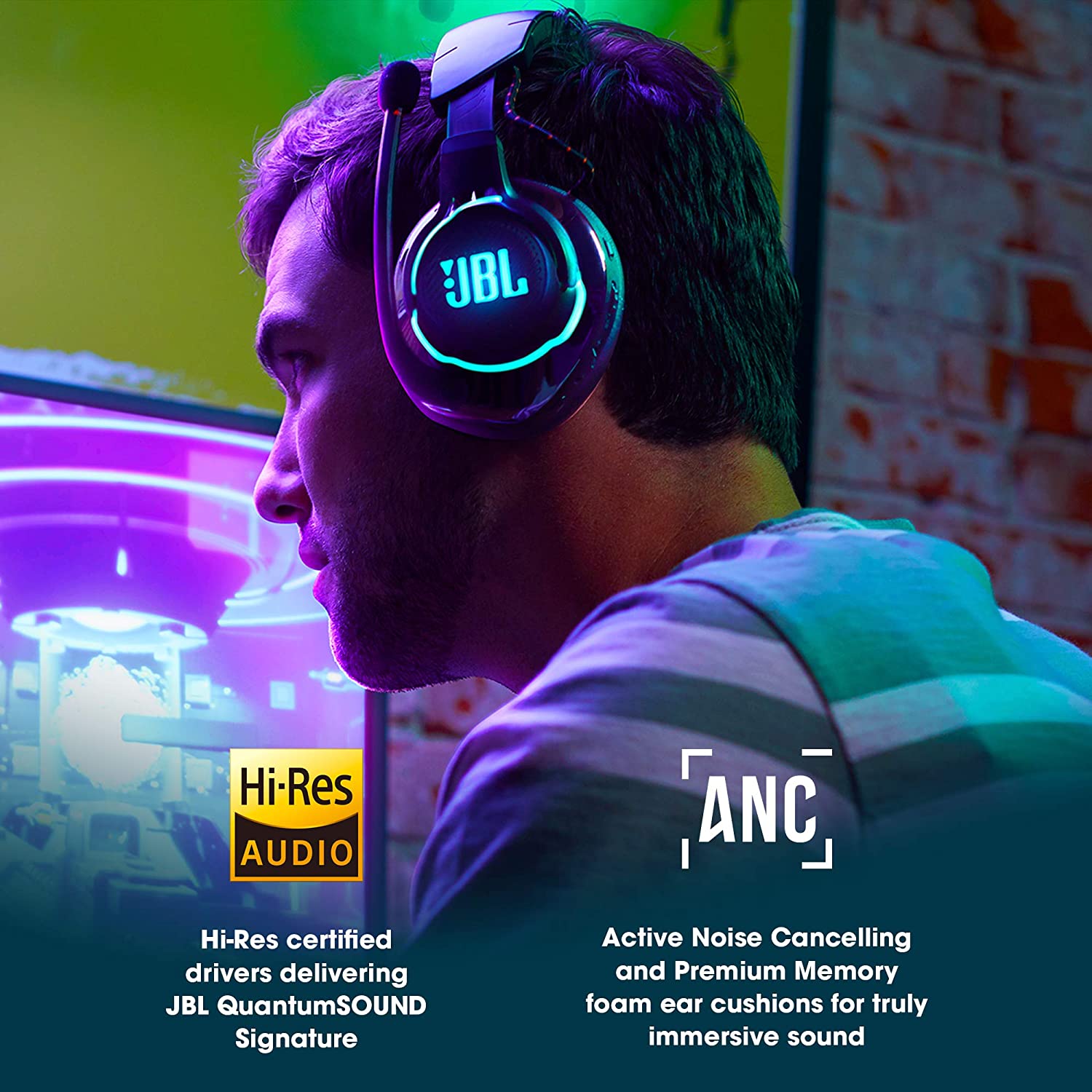 Active Noise Cancelling tuned for gamingDesigned for gaming environments, the Active Noise Cancelling system eliminates unwanted background sounds so you can stay fully engaged in combat without distractions. | Be at the center of the game with Hi-Res certified JBL QuantumSOUND SignatureFrom the tiniest footsteps to the loudest explosion, the JBL Quantum 800 headset makes every scene epic and every gamer more competitive. Our signature audio – powered by Hi-Res certified 50mm drivers and the JBL QuantumSOUND Signature – delivers the most realistic soundscape for a competitive advantage in any battle. JBL Quantum 800 headsets are gaming-grade, lossless 2.4GHz, and Bluetooth 5.0 dual wireless audio equipped, complete with a 14-hour battery life. | Compatible with all gaming platformsThe JBL Quantum 800 headset is compatible via 2.4GHz wireless connection on PC, PS4, Mac and VR. Compatible via 3.5mm audio jack with PC, PlayStation, Xbox, Nintendo Switch, Mobile, Mac and VR. You can connect via Bluetooth 5.0 to any Bluetooth enabled device. The JBL QuantumSURROUND is only available on PC |