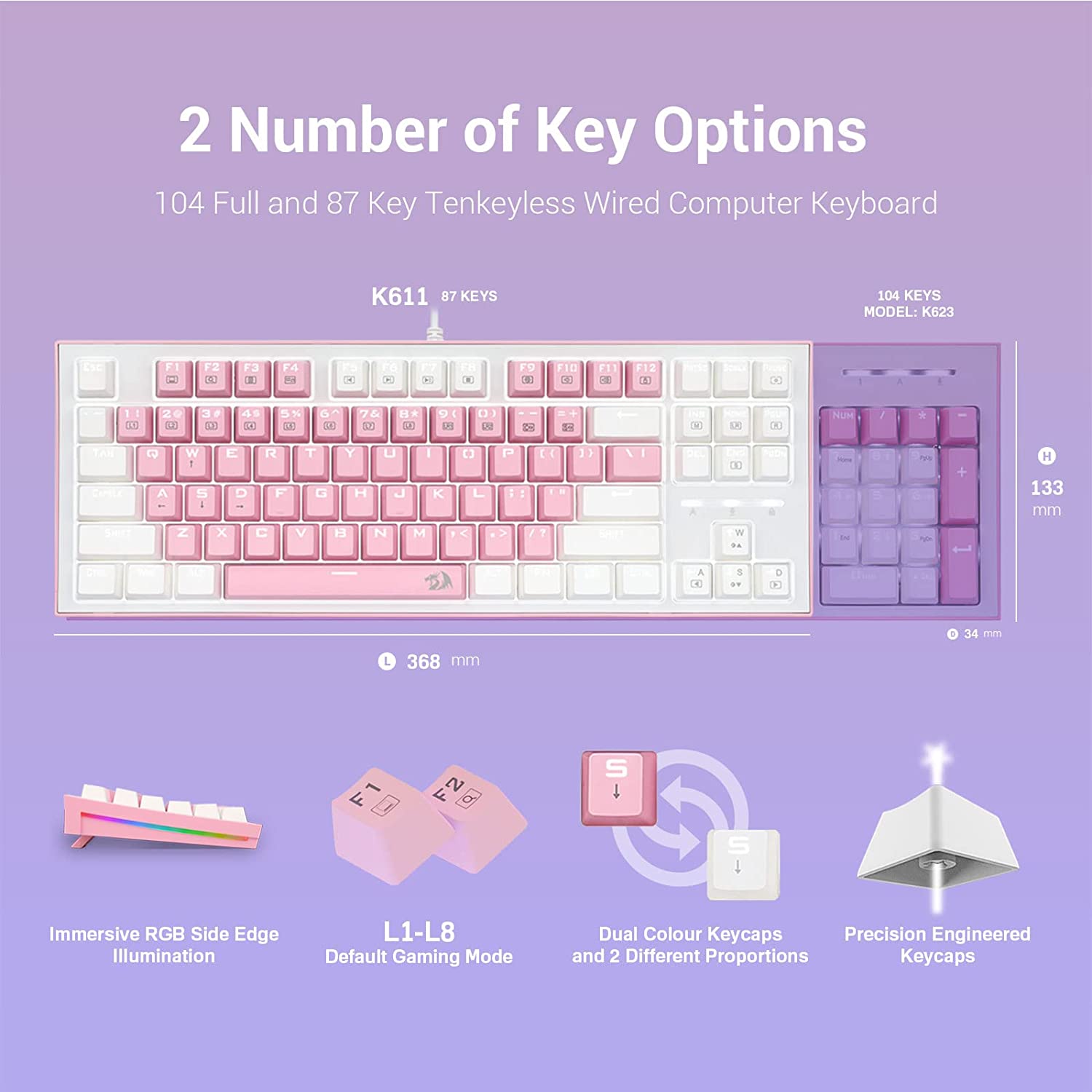 - Dual Color keycaps in Pink and White