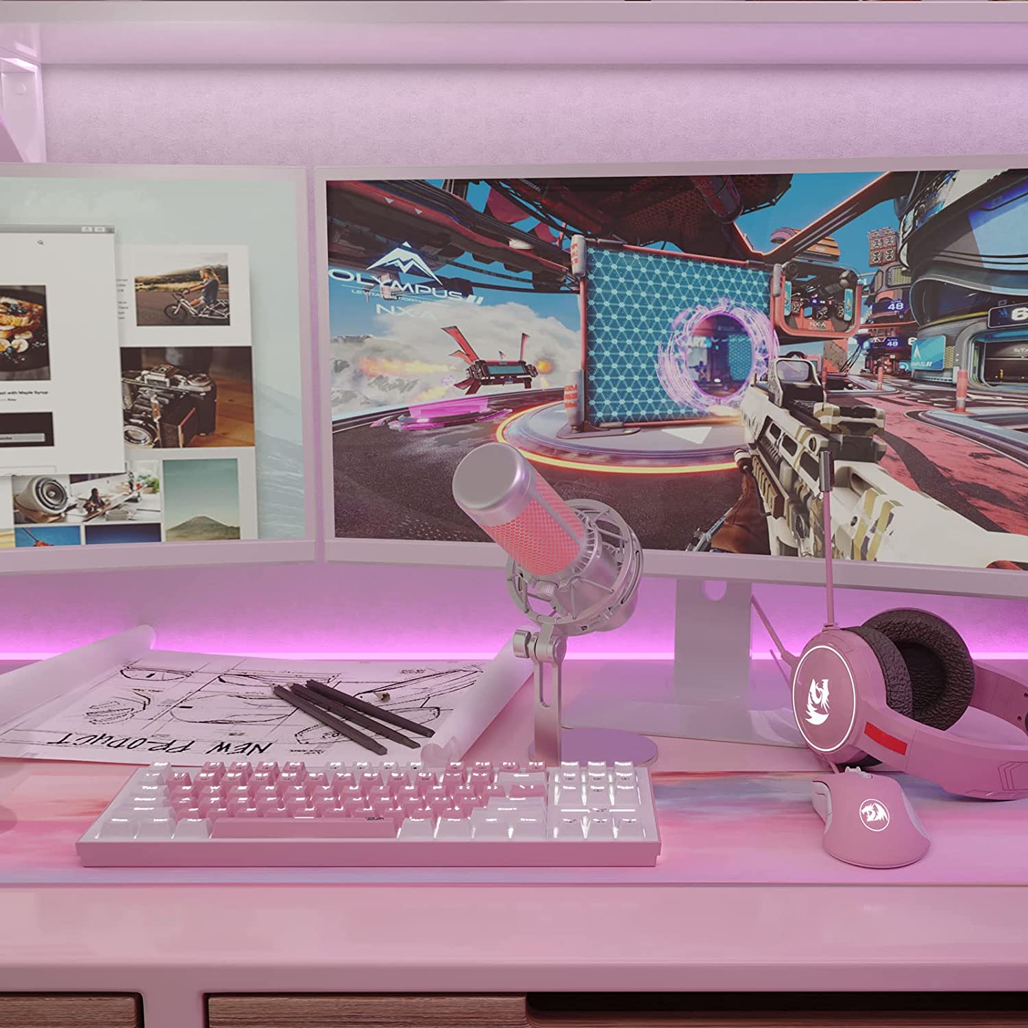 - Dual Color keycaps (Pink / White)