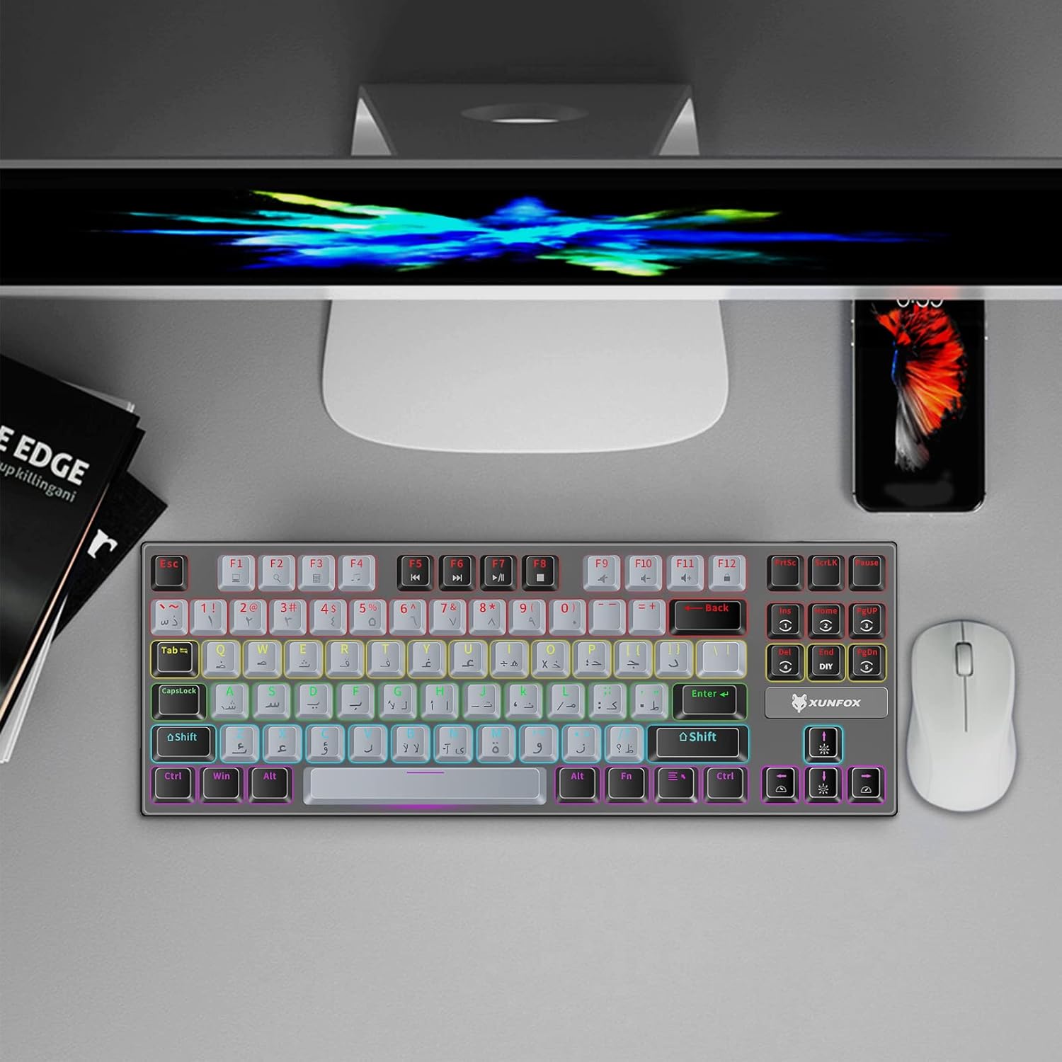 Xunfox K80 Gaming Keyboard , Blue Mechanical Switch – Rainbow backlight – 87 Keys TKL Size Mechanical Keyboard – Double-shot injection Moulded keycaps – Clicky and Loud Switch great players- Arabic & English Keys | Grey / Black